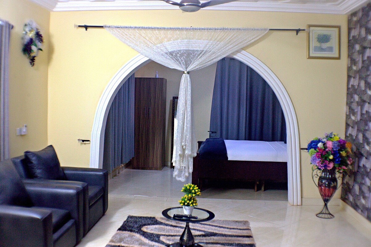 Dieses gut eingerichtete Executive-Wohnung mit einem Schlafzimmer und einem großen Flur ist die richtige Wahl für dich. Dieses wunderschön eingerichtete Apartment verfügt über ein Kingsize-Bett, installierte Warmwasserbereiter, Sofas, Sat-TV-Kanäle, einen Schreibtisch, Kühlschrank, Klimaanlage, Kicthen, Zimmerreinigungsservice rund um die Uhr, kostenloses WLAN usw. Diese Wohnung befindet sich in Weija, Accra, und verfügt über ein geräumiges Gelände, auf dem du deine Veranstaltungen ausrichten kannst. Es ist perfekt für Paare oder Singles. Reserviere jetzt ein Teil bei uns:)