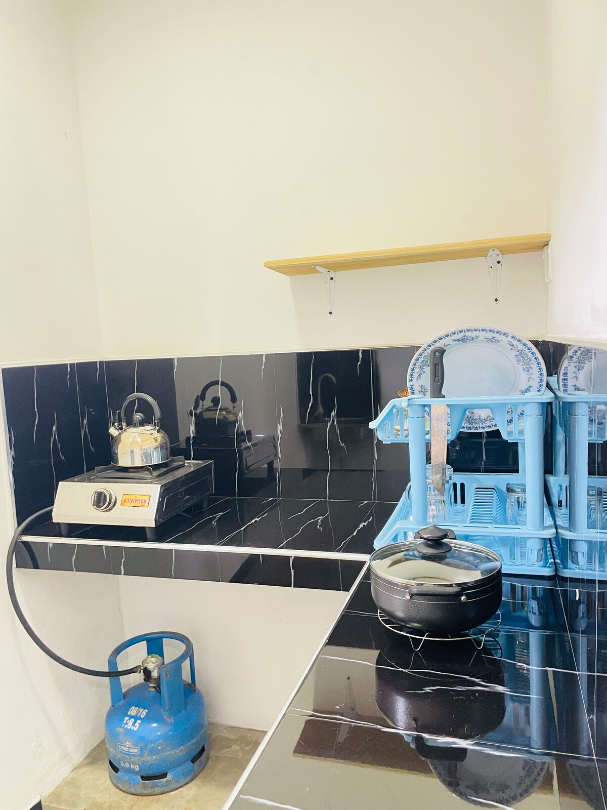 Enjoy a comfortable stay in our spacious room featuring two double beds and an attached private bathroom, making it ideal for couples, families, or friends. Guests can relax in the shared common area and prepare light meals in the open kitchen. Surrounded by lush greenery, the property offers a calm and peaceful environment, perfect for unwinding and enjoying nature while having all essential comforts for a pleasant stay.