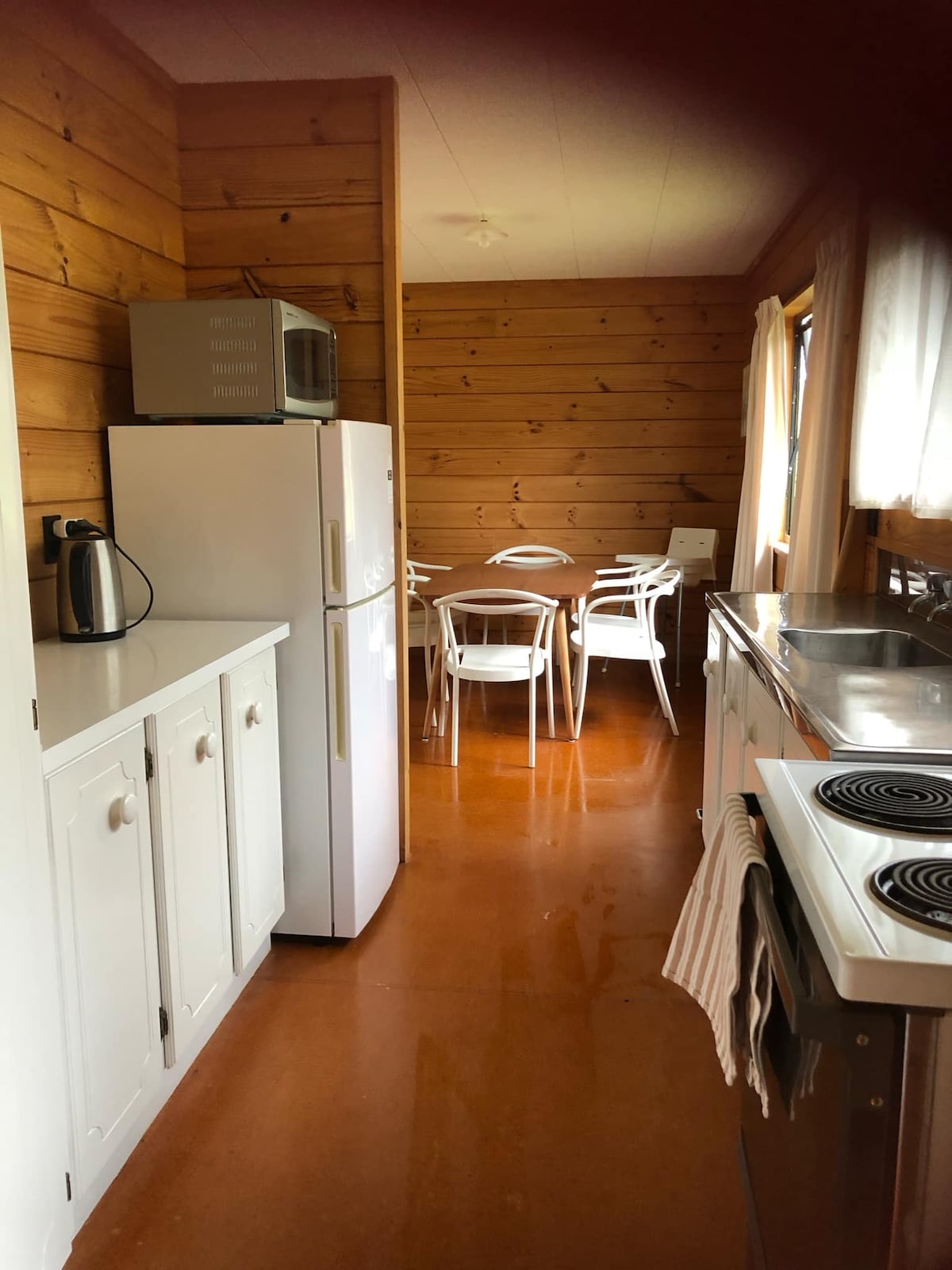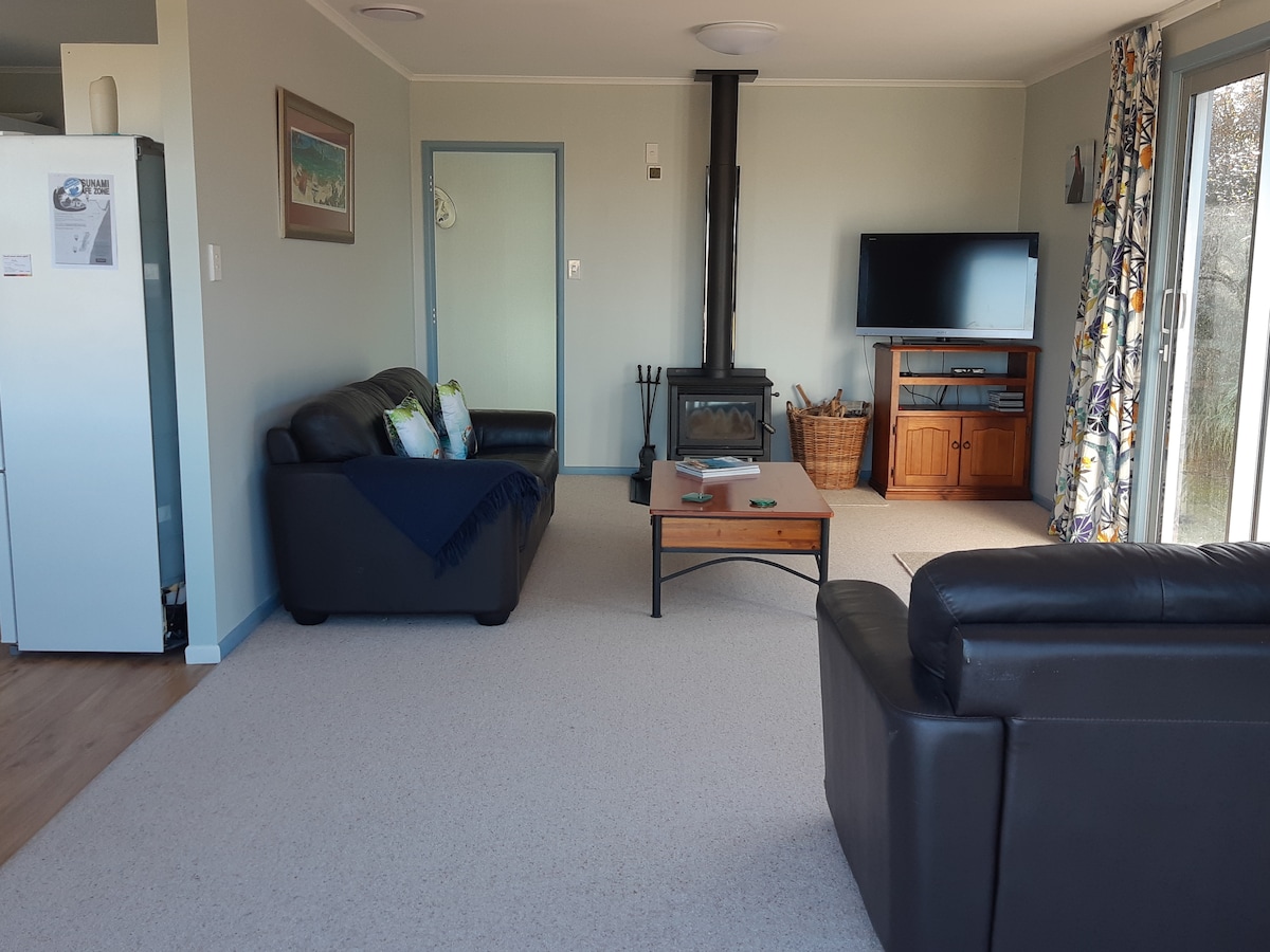 Welcome to our family bach, our wee slice of paradise! This lovely 3 bedroom bungalow backs onto the golf course and is located just across the road from the beach. It sleeps 7 people in 2 queen beds, bunks and another single. Only a few minutes walk to the playground, shop, tennis courts and many fishing options. There is a fabulous private backyard and great bbq area. This little gem is great for summer holidays as well as winter, as it has a fireplace that quickly heats the whole house.