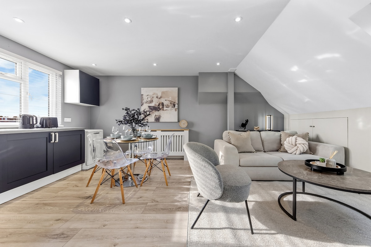 Diese luxuriöse Unterkunft im obersten Stockwerk mit Blick auf die Felder lädt zum Entspannen ein. Ultra-sauber, ruhig und schön gestaltet. Ausgestattet mit allem, was Sie brauchen, und mehr. Mit der Ninja Luxe Kaffeemaschine kannst du frischen Kaffee zubereiten. Streamen Sie Ihre Lieblingssendungen auf den Smart-TVs, spielen Sie Brettspiele in der Gruppe oder arbeiten Sie dort, wo die Aussicht Sie inspiriert. Was auch immer der Zweck deines Aufenthalts ist, ob du arbeitest oder dich entspannst – hier bist du richtig! London ist ganz in der Nähe, aber es fühlt sich wie eine andere Welt an. Und immer einen Parkplatz!