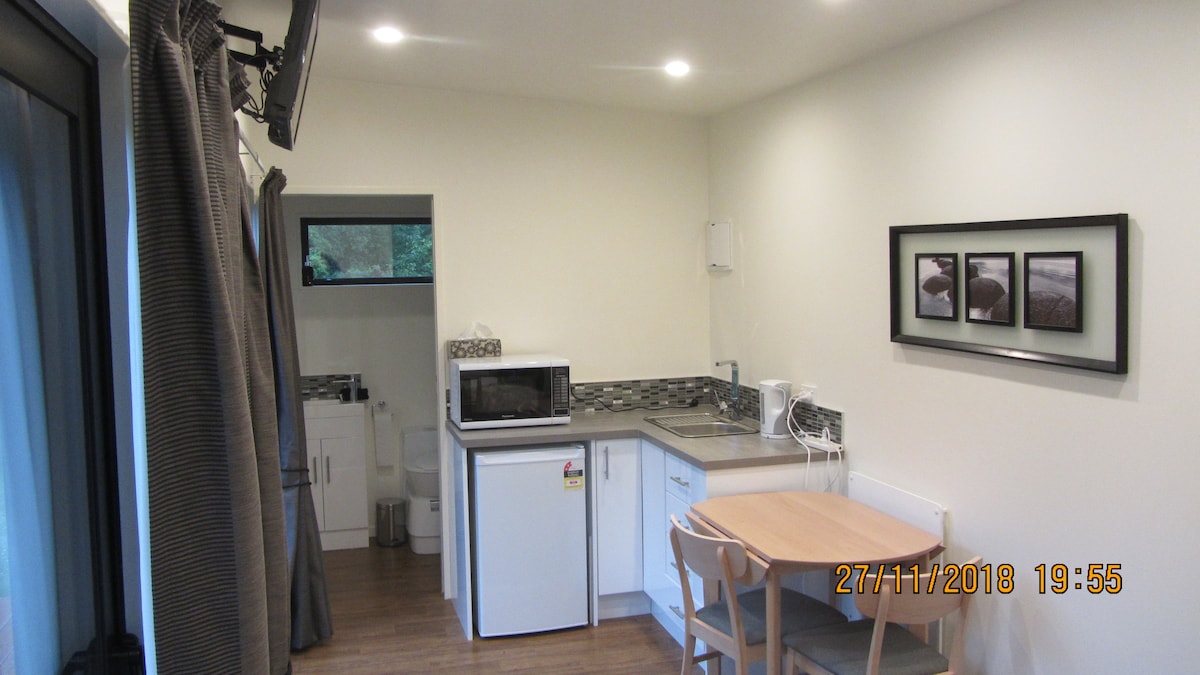 Zeitgenössische, eigenständige, moderne Hütte in einer ruhigen und privaten Gartenanlage. Es verfügt über 2 doppelt verglaste Türen, die zu einer Terrasse mit Sitzgelegenheiten im Freien führen. Separater Zugang, mit Parkplatz an der Seite der Hütte. Zusätzliche Parkplätze stehen im angrenzenden Paddock mit Tor zur Gasse zur Verfügung. Die Hütte verfügt über Starlink-WLAN mit hervorragender WLAN-Verbindung. Die Hütte befindet sich in einem Lifestyle-Block mit ausgedehnten Gärten, Obstgarten, Kräutergarten, Schafen, Hühnern und Hydrokultursystem.