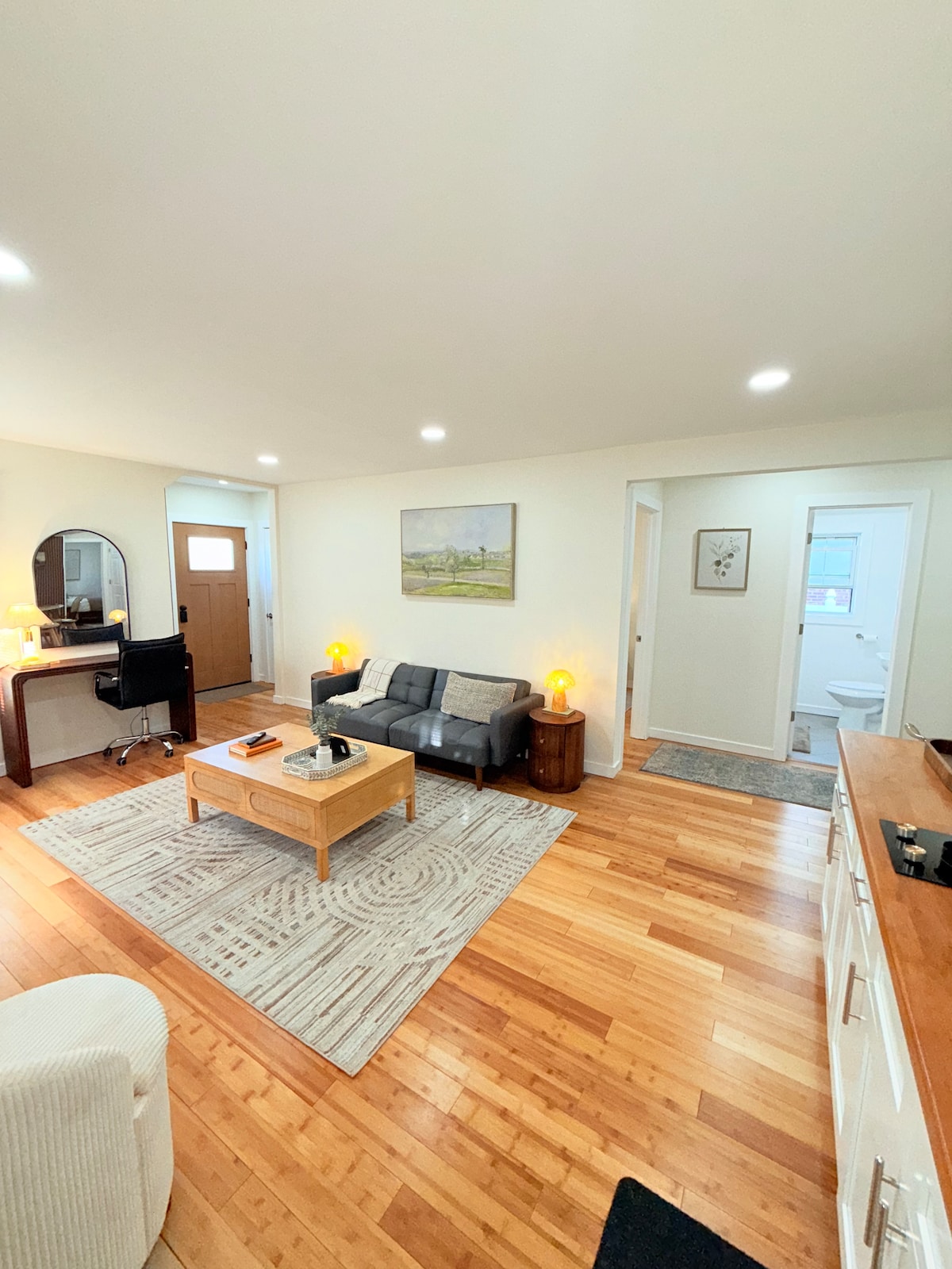 The Serenity Suite is a functionally designed, open concept, lower level space with its own PRIVATE entrance, kitchen, bedroom, bathroom and seating areas. With a clean contemporary design and furnishings, The Serenity Suite provides a cozy, serene and safe environment. Unwind and relax, in this newly renovated suburban Suite located 10 mins. from the UBS Arena and Belmont Park, 5 mins from the Belt and Southern State Parkways, 15 mins from JFK, 10 mins to LIRR and 25 mins to LGA.