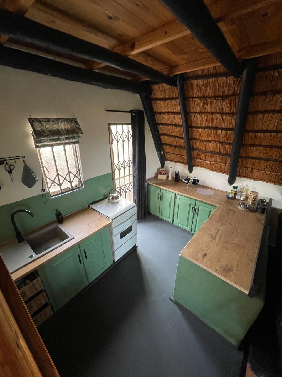 Thatched with open-plan sleeping/living room with king size bed or two single beds. Separate kitchen and bathroom with a shower only. Fully fenced yard with private braai.. Situated at the foot of the hill close to the river. Reachable by car.