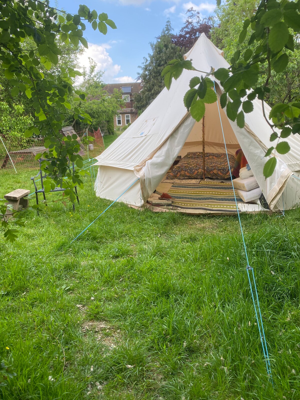 Enjoy the lovely setting of this peaceful spot in nature. Our new glamping canvas tent has a comfy double bed, a pull out sofa bed and a single futon so can sleep up to 5. The tent is next to our veg patches in our orchard but there is plenty of space and fields around. We are directly on a footpath that leads to the Vanguard Way so good walking from the door. One set of linen provided for double bed. For more people please bring your own bedding and linen. Xtra provided at cost.