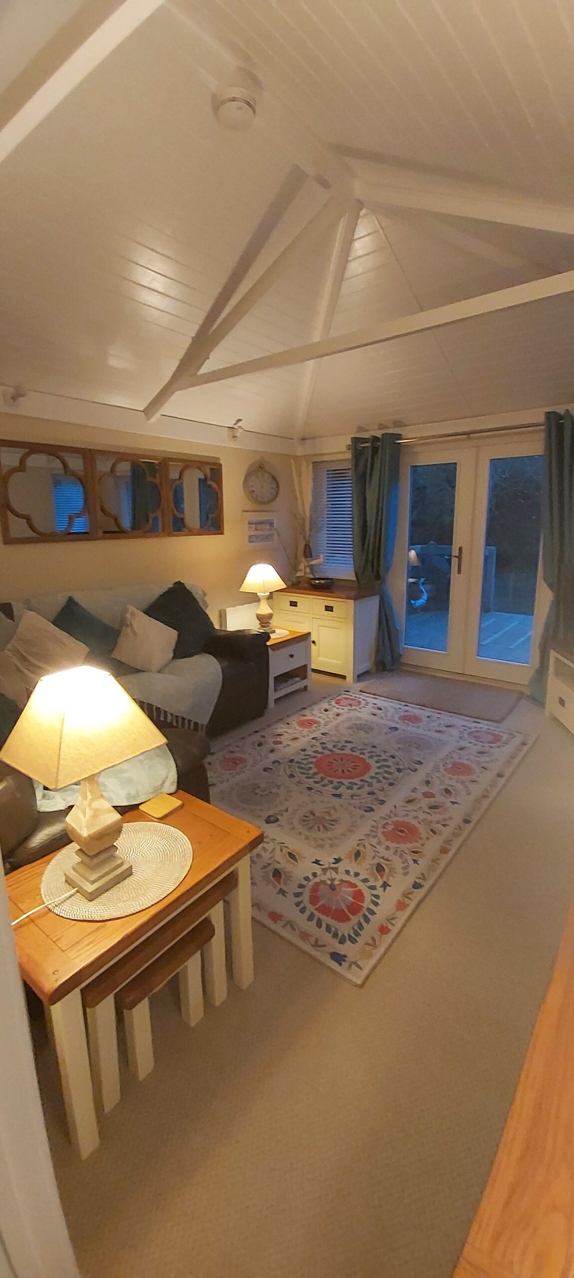 ‘The Lodge’ with hot tub is the latest addition to our lets A light & airy studio (30 sq m approx) Standard double bed, Kitchenette/ living area & en suite shower with eco- friendly toilet.. It is located by foot 100 metres from the main house down a public footpath. It has its own private entrance and a fully fenced garden ideal for a dog. We cater for guests looking for a relaxing night away. We are not a party venue. Music must be kept at a very low level at all times.