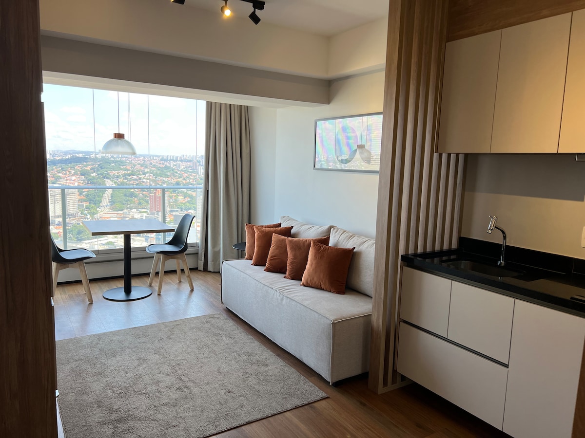 Neues Studio mit Panoramablick – 24. Etage mit Infinity-Pool und Stil! Genieße São Paulo in Komfort und Stil in unserem Studio, das liebevoll eingerichtet ist, um dich willkommen zu heißen. Das Hotel liegt im 24. Stock mit *180° Glasblick auf die Pinheiros Schnellstraße*. Ein moderner Rückzugsort, ideal für diejenigen, die Zweckmäßigkeit, Komfort und ein einzigartiges Erlebnis in der Stadt suchen.