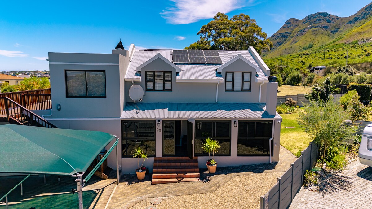 Dieses Haus liegt ganz oben auf Noordhoek und bietet von jedem Zimmer aus einen weiten Blick. Das Haus verfügt über 3 Schlafzimmer mit eigenem Bad. Der offene Grundriss eignet sich für die Geräumigkeit des Hauses. Sowohl Innen- als auch Außengrillplätze bedeuten jederzeit unterhaltsam, während du die majestätischen, einzigartigen Sonnenuntergänge genießt. Ein hinteres Tor öffnet sich zum Hügel hinter dem Haus, wo du eine gemütliche Wanderung genießen kannst. An Regentagen kannst du dich vor dem Feuer kuscheln, um dir einen Film im Heimkino anzusehen.