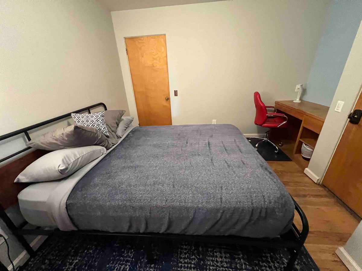 The private upstairs room offers a modest main space, with new queen size bed, small closet, in-room dedicated workspace. *There is a new AC in the bedroom* The shared spaces feature numerous amenities: (1) five HEPA air filters, (2) a well stocked kitchen with 5 burner gas range, (3) Dining Room with large cooler, dishwasher, and beverage crafting area, (4) a Billiards Room with weight lifting rack and workout area, and (5) laundry room access from 5pm-11pm, and 5am-12pm daily.