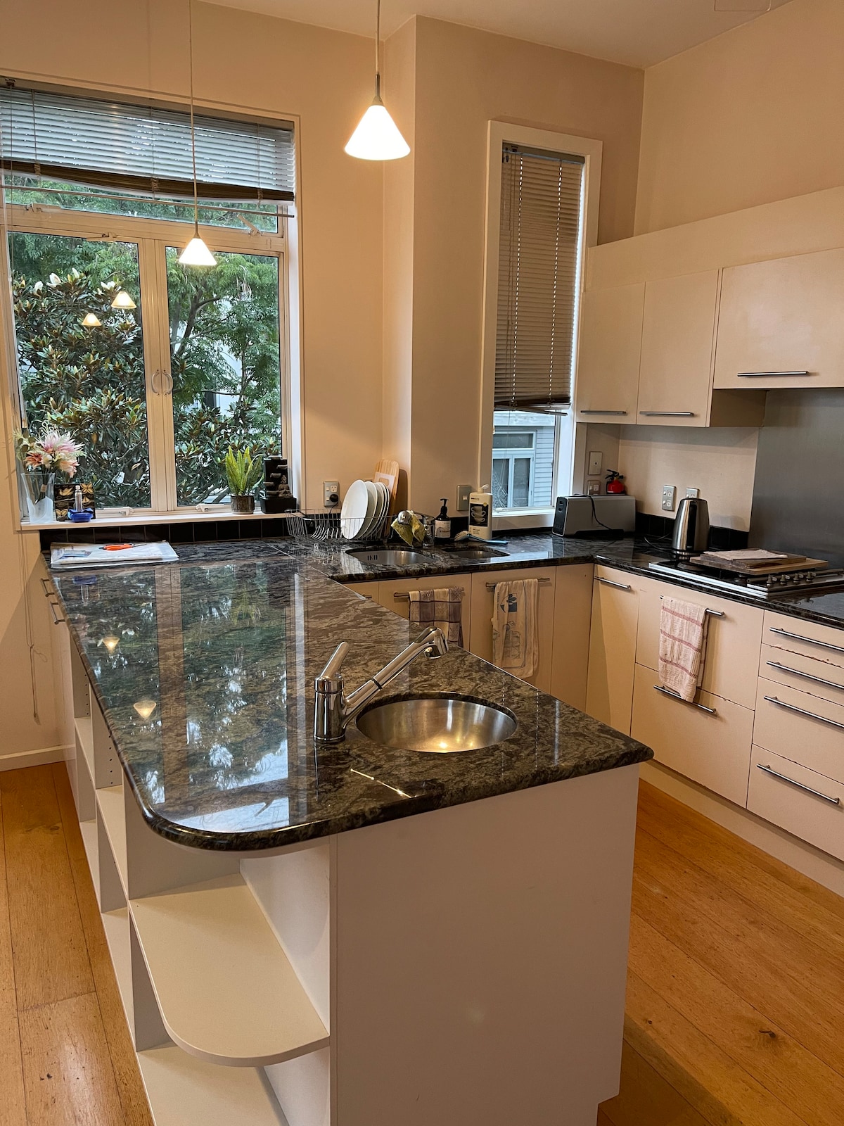 Bereite Mahlzeiten in der offenen Gourmetküche zu und genieße sie im Freien in einem unvergesslichen neuseeländischen Haus, das sich über zwei Ebenen erstreckt. Unterhalte Freunde und Familie in diesem Raum mit hochwertigen Designer-Oberflächen, einem gemütlichen Kamin und luxuriösen Badezimmern. ☆ Zwei Wohnbereiche ☆ Garagenstellplatz für zwei Autos ☆ Ruhige Nachbarschaft ☆ Weitläufig 283 m ² Wohnfläche ☆ Unbegrenztes High-Speed-WLAN und Netflix ☆ Voll ausgestattete Küche, Badezimmer und Waschküche