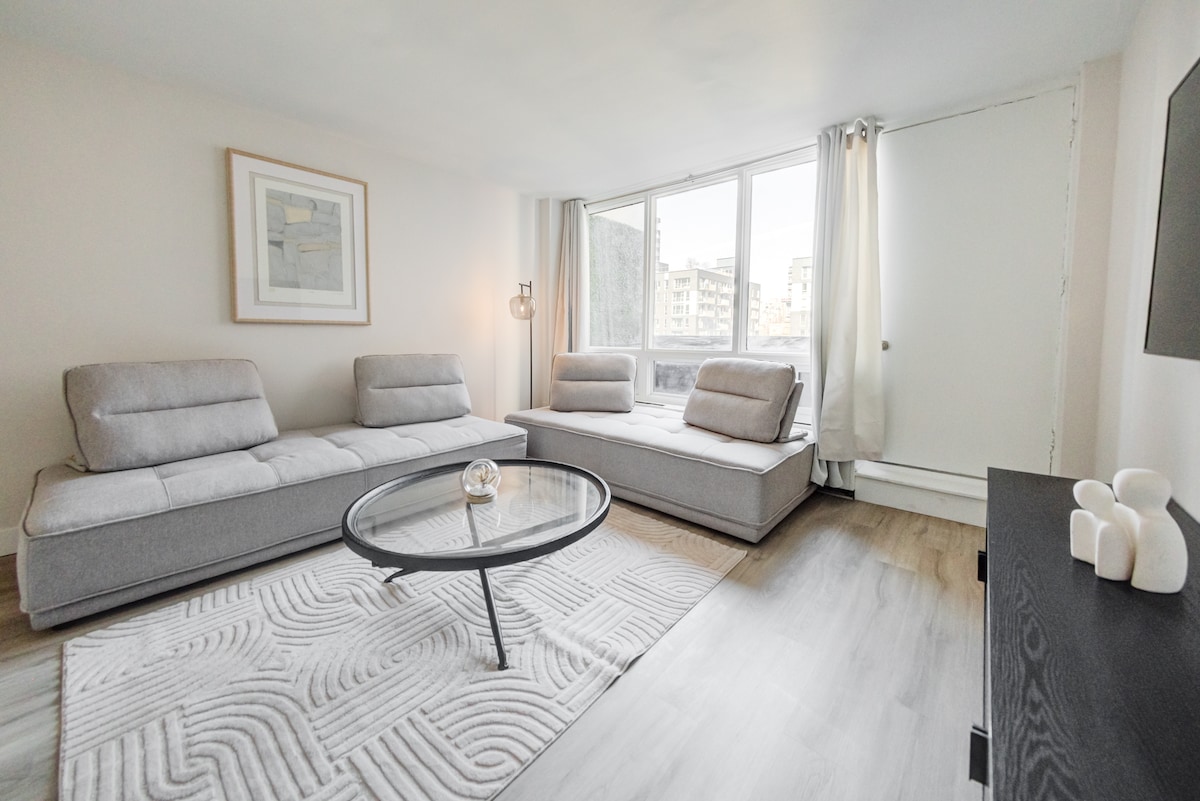 Enjoy your stay in this elegant one-bedroom apartment with breathtaking skyline views, right in the heart of Downtown Montréal. Set in a safe, lively yet peaceful neighborhood, you’re steps away from universities, top restaurants, museums, shopping, and metro stations perfect for exploring the city on foot. Enjoy a private bedroom with a comfortable king bed, a fully equipped kitchen, a spacious living area, and fast Wi-Fi everything you need for a seamless, stylish stay.