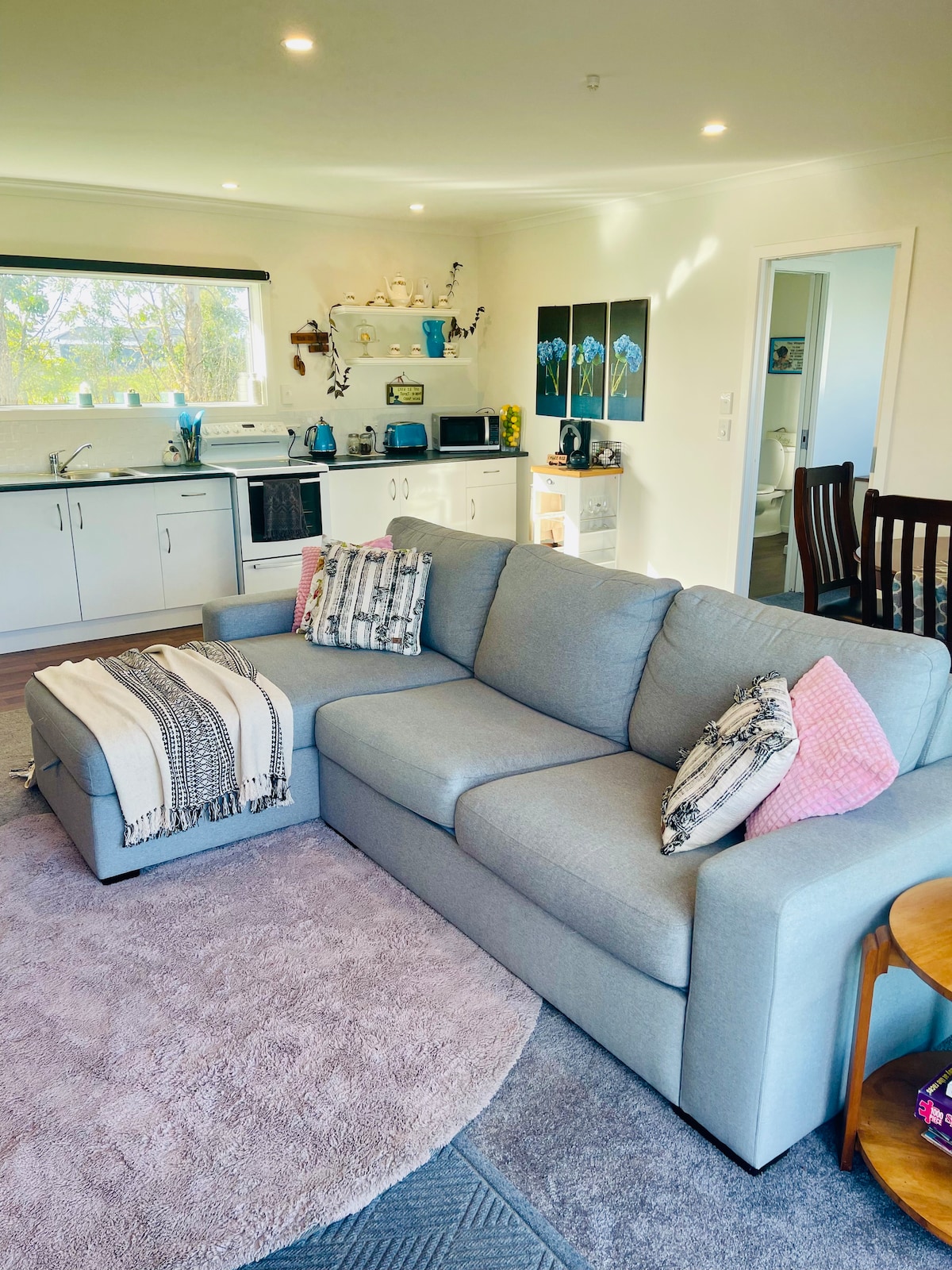 This new build rural property is located 18km from Wanganui and 10km from Kai Iwi Beach giving you the best of both worlds; near enough to town also tucked away enough to enjoy and relax in the serenity of the country side. The Paddock has one bedroom with a queen size bed and sofa bed, plenty of room for your luggage, tastefully decorated in a french country cottage style with large stacker doors that take in the view, ready to welcome in the mornings with a coffee from the coffee bar.