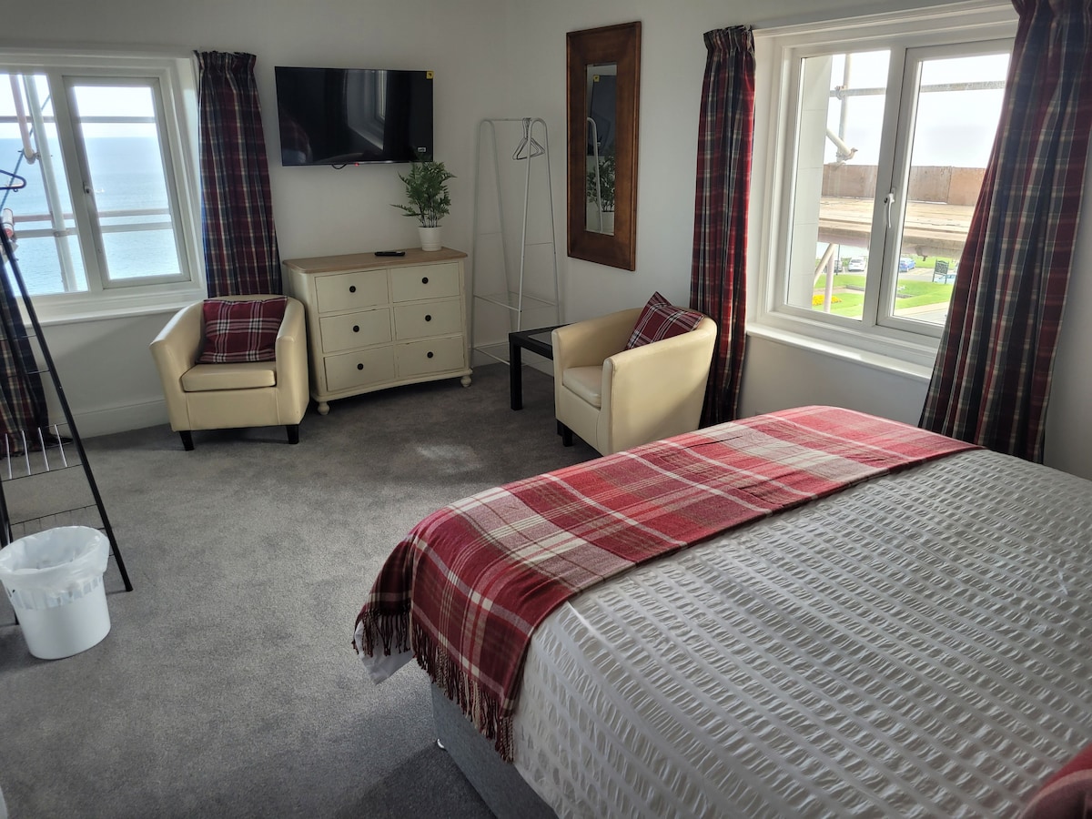 Ein schönes Zimmer für Paare an der Ecke des Gebäudes mit Blick über den Strand auf das Meer von einem Fenster und über den Hafen zur St. Mary's Church vom anderen. Es verfügt über ein Kingsize-Doppelbett und eine Sitzecke mit Tischstühlen und einem großen Smart-TV. Es gibt eine Erfrischungstheke mit Kühlschrank, Waschbecken und Wasserkocher und es gibt ein neues eigenes Duschbad. Dieses neu renovierte Zimmer auf der 3. Etage ist modern mit schöner Einrichtung. Enthalten ist ein Kontantal-Frühstück mit Müsli, Saft, Tee/Kaffee