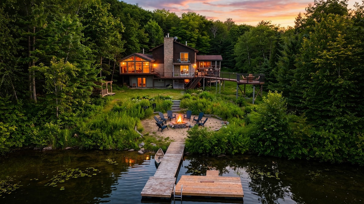 Rückzugsort am See bei Sonnenuntergang mit Kajaks, Feuerstelle, Grill