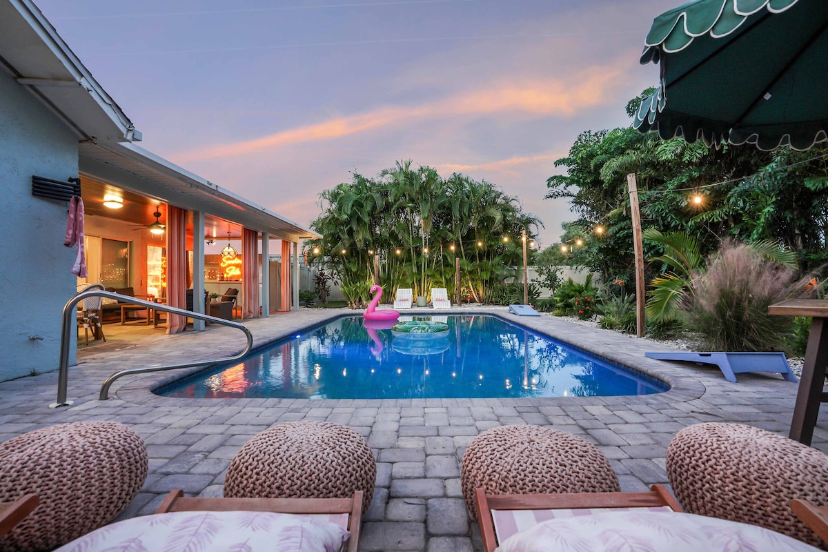Genieße die Sonne Floridas in einem atemberaubenden, frisch renovierten 4/2 Poolhaus! Wir haben fast alles zur Verfügung gestellt, was wir uns vorstellen konnten, einschließlich fünf 4k-Fernsehern mit Netflix und Kabel, WLAN, beheiztem (optional) Salzwasserpool mit 7' Sichtschutzzaun, Fahrräder für Erwachsene, Strandausrüstung, Pack & Play, Büro, Brettspiele, entspannenden Liegestühlen, gefüllter Küche, Waschmaschine & Trockner, Garagenparkplatz, Hundekiste, alles in einer ruhigen und sicheren Gegend. Oh, und natürlich sind es nur 5 Meilen zu weltberühmten Stränden.