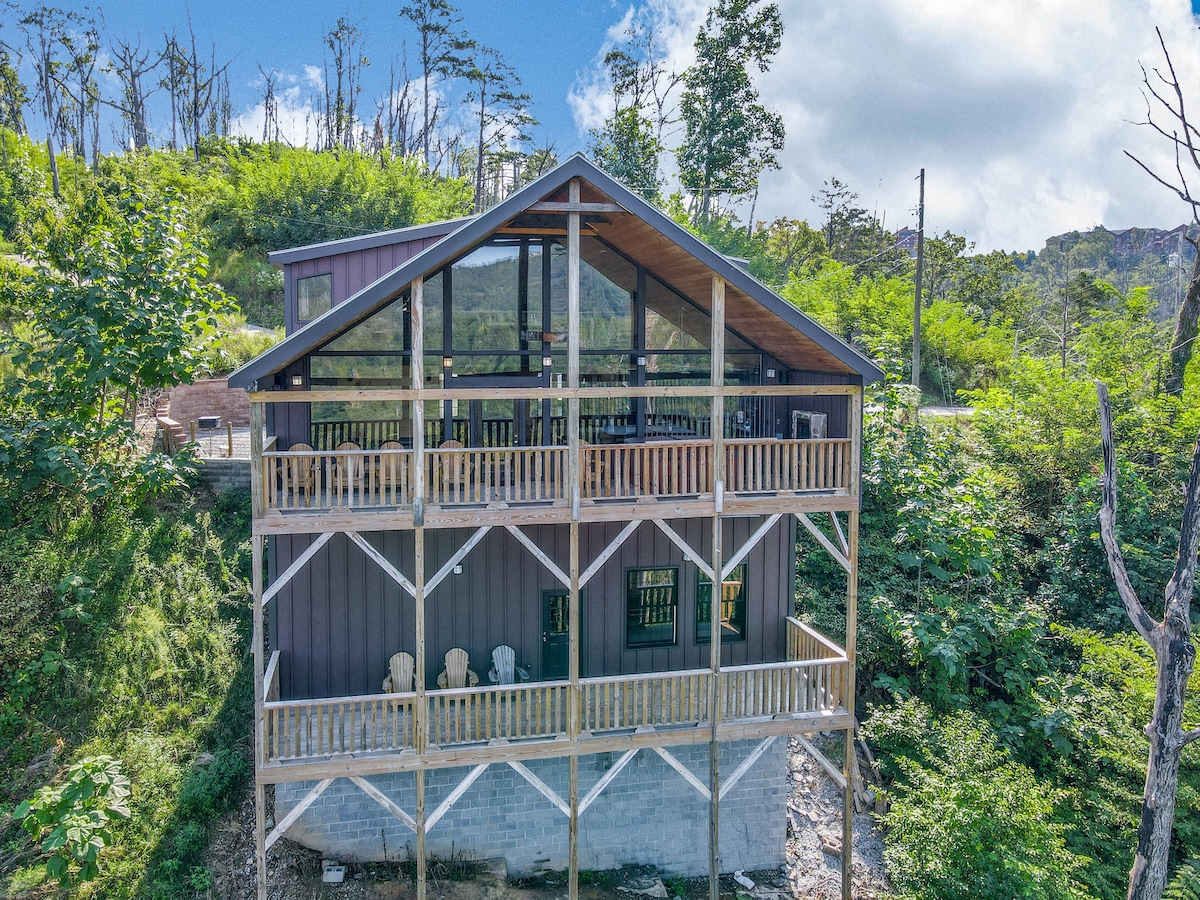 Der perfekte Kurzurlaub. Atemberaubend. Diese atemberaubende gehobene Unterkunft bietet einen atemberaubenden und weitläufigen Blick auf den Great-Smoky-Mountains-Nationalpark von zuhause aus. Dieses Haus und Grundstück mit modernem Kabinendesign verfügt über einen Whirlpool, einen Gasgrill, ein Spielzimmer, zwei Wohnzimmer und eine Airbnb-Seltenheit: private Badezimmer für jedes Schlafzimmer. Dein privater Urlaub in den Bergen! Barrierefrei und friedlich, nur 15 Minuten von Lebensmittelgeschäften und Restaurants entfernt. Übernachte hier und schaffe Erinnerungen, die ein Leben lang halten!