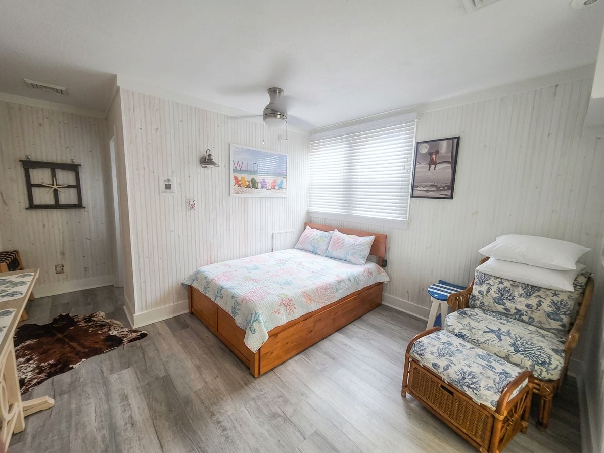 Gemütliche Effizienz am Wasser mit doppelten Schiebetüren zu einer gemeinsamen Terrasse mit maßgefertigten Picknicktischen aus Verbundwerkstoff und einem Propangrill. Aluminium-Laufsteg, der zu einem privaten Dock zum Schwimmen, Wassersport, Angeln oder Krabbenfischen führt. Außendusche! Komplettes eigenes Badezimmer mit ebenerdiger Dusche. Queensize-Murphy-Bett, Großbildfernseher, Couch und Esstisch. Voll ausgestattete Küche mit Frühstücksbar und Hockern. Gäste müssen Badetücher, Queensize-Bettwäsche und 2 Kissenbezüge mitbringen! BOOTSSTEG VERFÜGBAR OKT. BIS MÄRZ!!