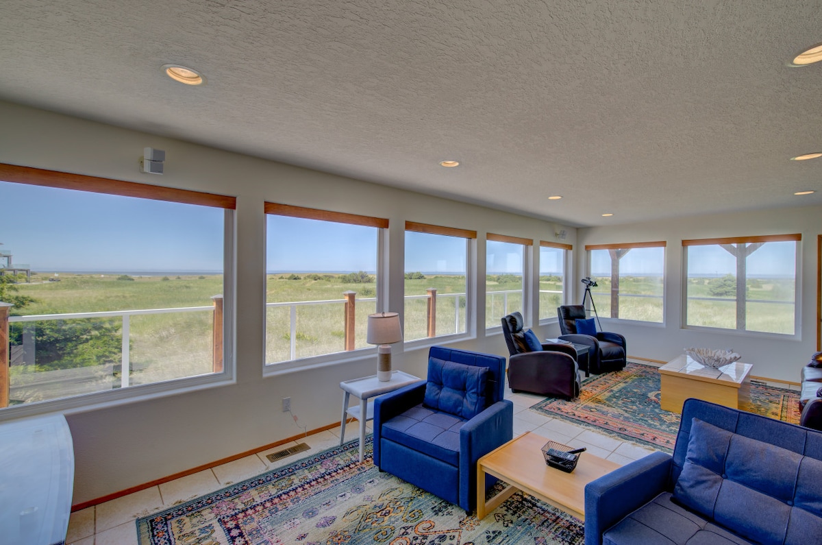 Ocean Breeze ist ein herrliches Haus in der malerischen und ruhigen Nachbarschaft von Gearhart. Unser Haus bietet einen Blick auf den Necanuim River und bietet einen atemberaubenden Blick auf den Fluss, den Nordpazifik, die Tillamook Head Mountains und die Stadt Seaside durch die Wand-zu-Wand-Fenster und hat direkten Zugang zu den Ufern der Mündung. Ocean Breeze ist ein perfekter Kurzurlaub für Spaß, Erholung, Entspannung, Aktivitäten und Treffen mit geliebten Menschen. 1 Meile vom lokalen Lieblingsrestaurant McMenamins Restaurant & Pub entfernt.