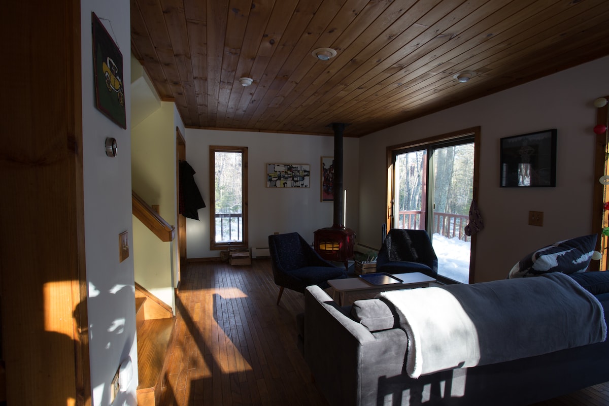 Komfortables, schön eingerichtetes, dreistöckiges Haus im Wald an einer Sackgasse (kaum ein Auto fährt vorbei) mit saisonalem Bergblick. Gute Küche. Jedes Schlafzimmer hat ein eigenes Bad. Wanderwege, Skifahren und Angeln in der Nähe; süßer Teich/Picknickplatz mit Wasserfall nur einen kurzen Spaziergang entfernt. Platz für 4 Erwachsene, 2 in jedem Schlafzimmer. Zusätzliche Gäste sollten Kinder sein, gemäß den örtlichen Gesetzen. Es gibt ein Schlafsofa im Untergeschoss und einen Schlafsessel im Hauptschlafzimmer. Genehmigung der Stadt Woodstock Nr. 20N-079