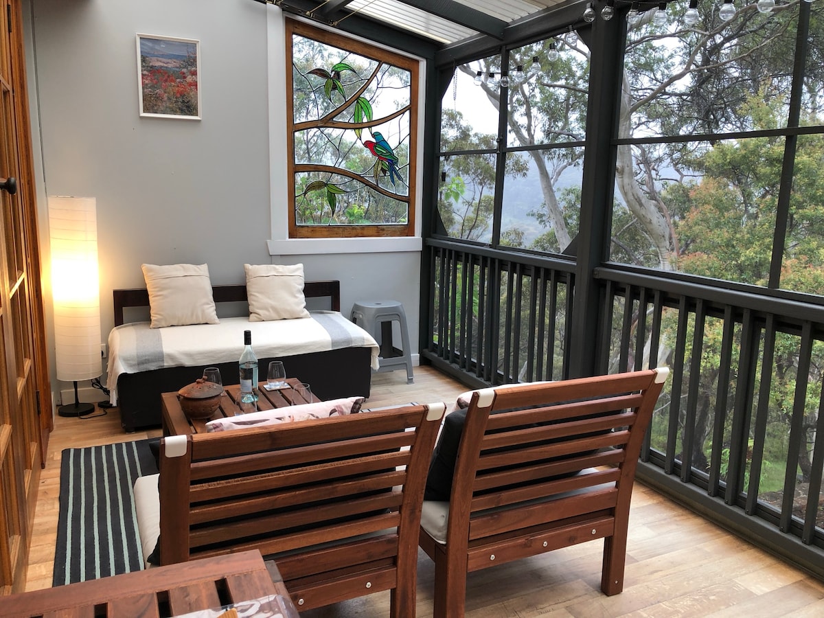 An Intimate & Charming, Self-Contained Hilltop Hideaway located on Darug Country, Blue Mountains Designed for relaxation & privacy throughout your stay. The comfortable & cosy accomodation is tailored to romantic, relaxing escapes or a peaceful getaway for two close friends to enjoy a quiet catch up Enjoy the eclectic rustic interiors & indoor fireplace. Dedicated private & leafy guest courtyard with firepit, vintage outdoor bath tub, and wood-fired pizza oven for an immersive mountain stay