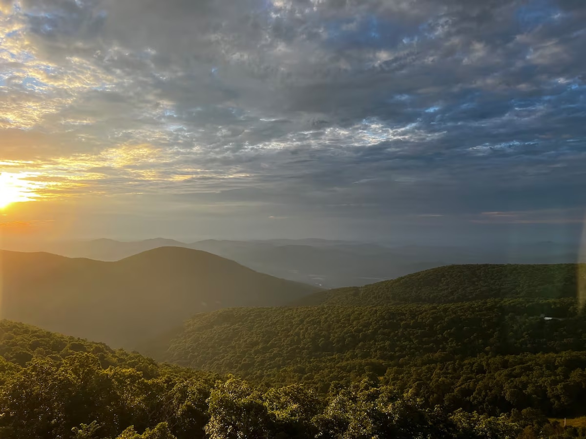 Unsere warme und einladende Wohnung verbindet erstaunliche Nähe zum Wandern mit einem atemberaubenden Blick auf die Blue Ridge Mountains und den 75 Meilen entfernten Horizont! Unsere Wohnung liegt nur 400 m zu Fuß vom nächsten Wanderweg entfernt und hat auch direkten Zugang zum Wandergebiet des Bergrückens – perfekter Ort für einen Morgenspaziergang! Dieser aktualisierte und moderne Raum mit Bergmotiven verfügt über: ✸ Neu renoviert! Moderne Küche mit✸ Vorräten! ✸ Zwei voll ausgestattete Badezimmer! ✸ Helix Hospitality Matratzen!! ✸ Gemütlicher Kamin mit Holz wird bereitgestellt!