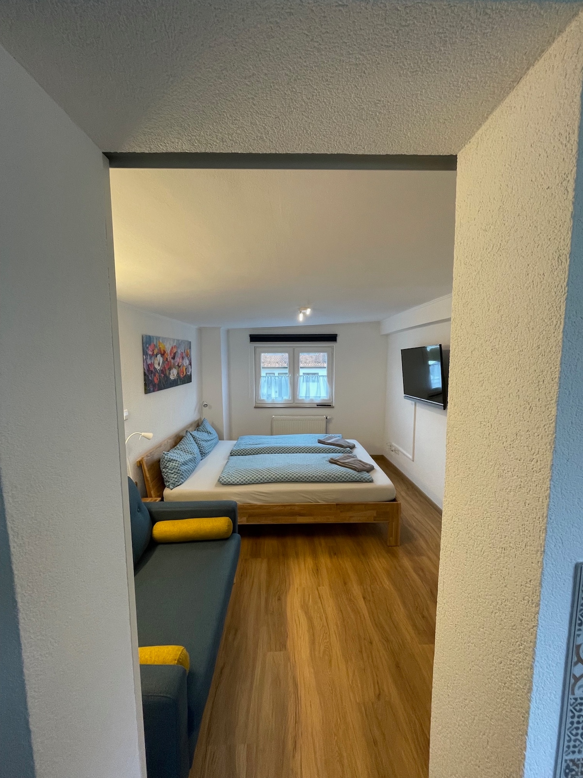 Wir bieten dir ein gemütliches Einzimmer-Apartment unter unserer Garage mit separatem Eingang. Es eignet sich gut, wenn du geschäftlich in der Gegend bist oder Schwäbisch Hall entdecken möchtest. Die Wohnung besteht aus einem größeren Wohn,- und Schlafbereich mit Bett, Schlafsofa, kleinem Esstisch, TV und Kaminofen. Das Bett beinhaltet ein ausziehbares Gästebett. Außerdem gibt es eine kleine Küche sowie ein kleines Bad. Der Garten kann mitbenutzt werden um die Sonne und Aussicht zu genießen.