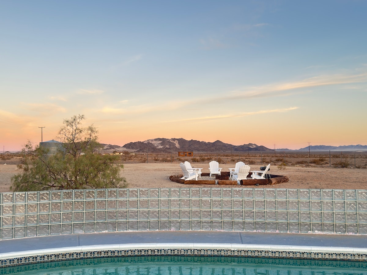 Dip into serenity at this SECLUDED Desert Retreat 25min from JoshuaTree NP's new entrance. This remodeled 1959 STUNNER sits on 5 fenced acres of tranquil desert land, surrounded by nothing but desert, sky and distance. Lights shifts across the space and silence becomes the experience. 2b/2b king bed house with a detached lounge/game room. Cozy up by the fire. Soak in the hottub/pool or sip a cocktail from the covered patios. Bring your loved one(s) and get ready to unwind and reconnect.
