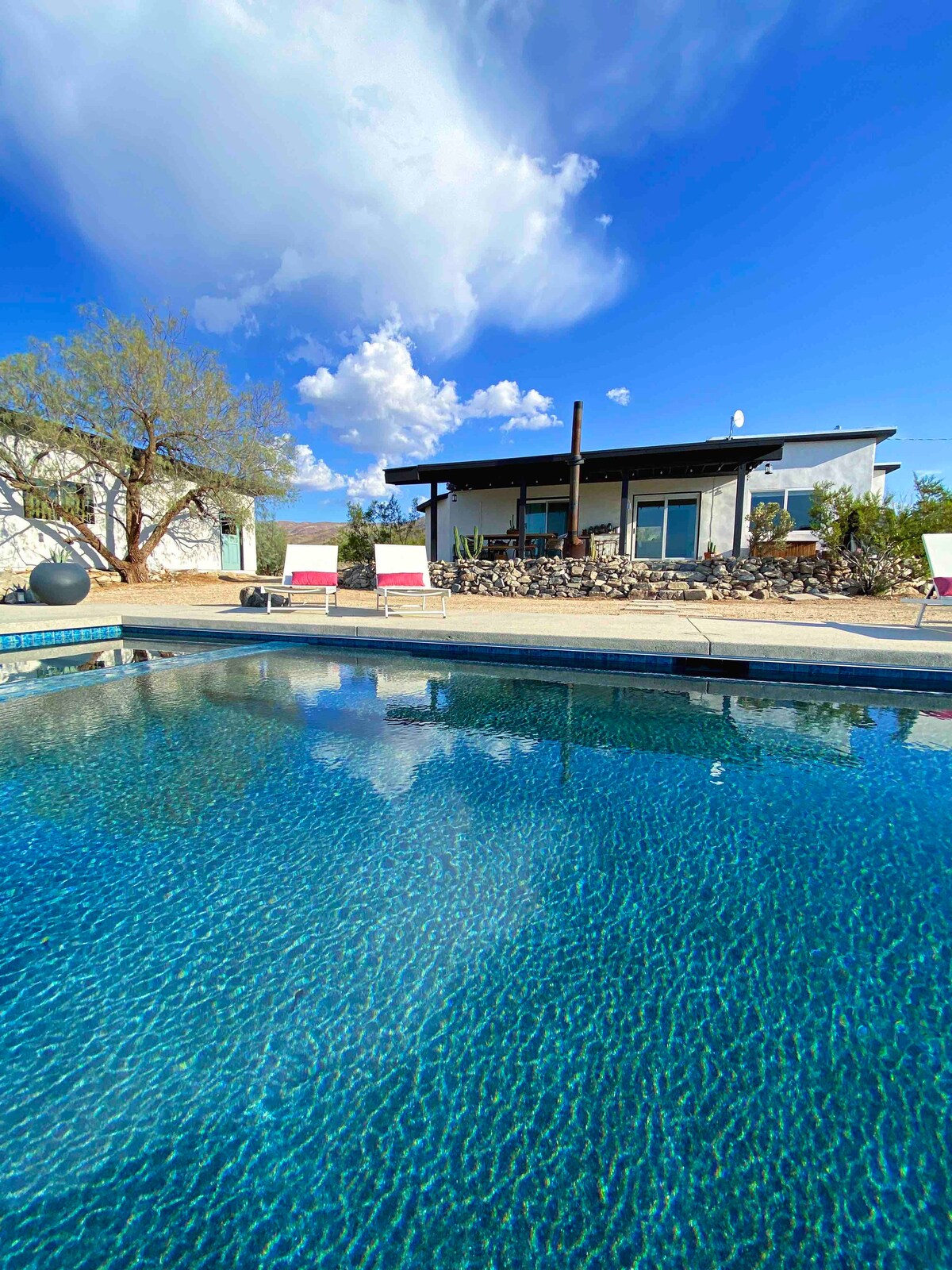 Tauche ein in die Ruhe in diesem abgelegenen Desert Retreat, 25 Minuten vom neuen Eingang des JoshuaTree NP entfernt. Dieser umgebaute STUNNER AUS dem Jahr 1959 liegt auf 5 Hektar ruhigem Wüstenland und bietet einen majestätischen Blick auf Wüste, Berge und STERNE. 2b/2b Kingsize-Bett-Haus mit einem freistehenden Spielzimmer/Lounge-Gebäude. Mach es dir an der Feuerstelle gemütlich, genieße den Whirlpool/Pool, trinke einen Kaffee oder schlürfe einen Cocktail von den überdachten Terrassen. Bring deine Liebsten mit und mach dich bereit, dich zu entspannen, wieder zu verbinden und den Wüstenlebensstil zu genießen.