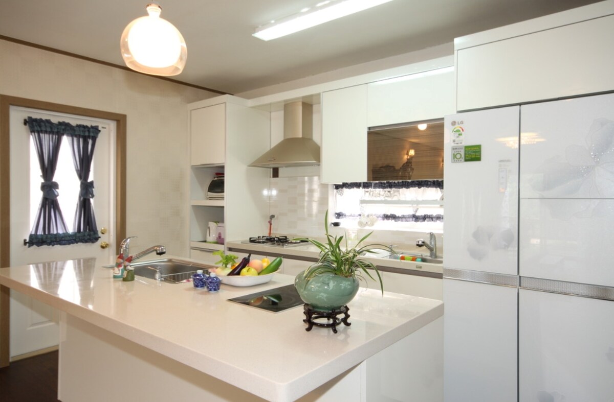 Bitte lesen Sie vor der Buchung unbedingt die Anweisungen und Nutzungsregeln für die Unterkunft. "Nur einen Tag lang dem Alltag entfliehen, in meinem eigenen Versteck vollkommen entspannen..." 'Hoesun' bedeutet 'ruhiges Versteck'. Dies ist ein naturnaher, privater Aufenthalt in einem abgelegenen Dorf in Yangpyeong. Das große Fenster im Wohnzimmer fängt die wunderschöne Naturlandschaft wie ein einziges Bild ein. Vor dem Fenster befindet sich ein großzügiges Lounge-Sofa, auf dem die ganze Familie Platz nehmen kann, und in der Mitte des Wohnzimmers befindet sich ein Indoor-Jacuzzi, den Sie das ganze Jahr über genießen können. Es gibt insgesamt 2 Schlafzimmer, jedes mit einem eigenen Bad und einem Kingsize-Bett. Der Außenpool wird je nach Jahreszeit mit warmem oder lauwarmem Wasser betrieben. Sie können besondere Erinnerungen an Wasserspiele in einem privaten Raum hinterlassen. Direkt neben der Unterkunft fließt ein flacher Sohacheon. Es ist auch möglich, ökologische Erfahrungen wie das Fangen von Gurami, Zebrafischen und kleinen Fischen zu machen. Stay Hoseun wird Ihnen eine ruhige Erholung schenken, wenn Sie aus dem komplizierten und langweiligen Alltag entkommen.