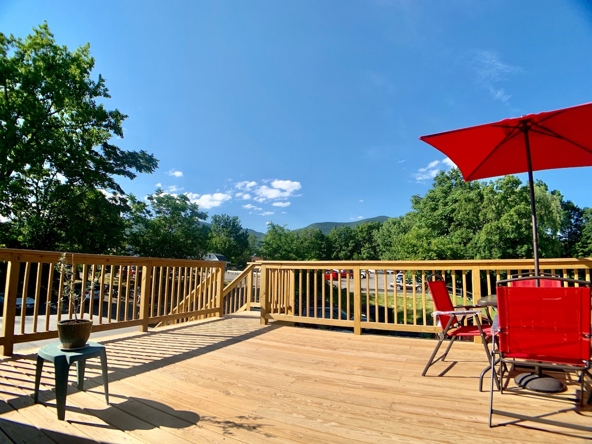 PRIVATE Modern/Rustic Apt WALK TO TOWN 5 * Rating "PREMIER" NO EXTRA CHARGES! 1000 sq ft Pet Friendly n/c Park Master King Suite &I can put up 2cots /crib Full Kitchen Cathedral Living Room w/Mountainview. 1 1/2 Bath Deck for Outside Dining w/Mountainview WOOD FIREPLACE ondeck Wi-Fi Wash/Dryer Gas BBQ Steps to CTR of Town Green & NYC Bus-stop, THE COLONY, Yum Yum, Goodnight , Garden Cafe, Silvias, Bread Alone, Mud Club, Station Bar, shops . Cemetery's Bubbling Stream, PrivatePlayground