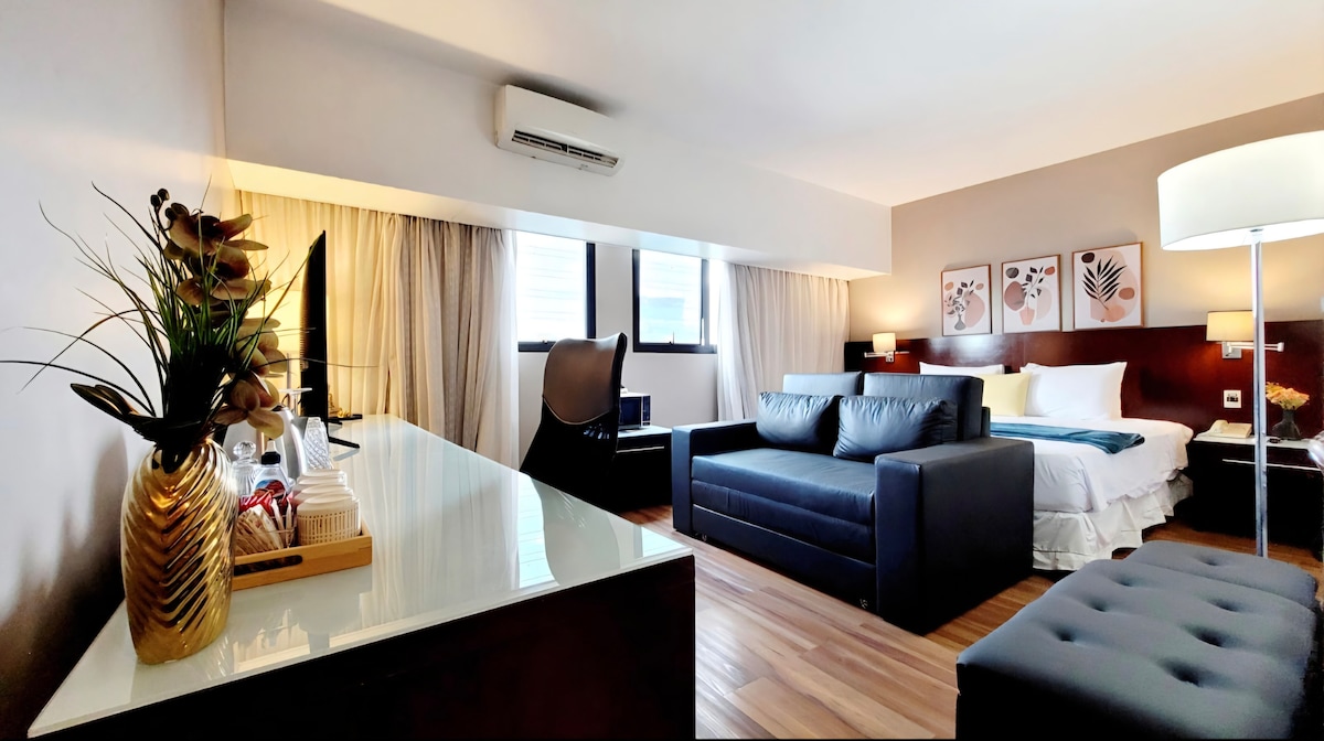 NYC Berrini was redesigned with a modern architectural concept and stands out in the building. Located on Rua Sansão Alves dos Santos, 13th floor, with views of the Marginal Pinheiros river, it is ideal for executives and selected guests in São Paulo. Features include a Queen bed, sofa bed, 55” Smart TV, 500 Mbps Wi-Fi, new air conditioning, two mini-fridges, coffee machine and daily housekeeping included. The building offers pool and sauna, close to restaurants, business areas and transport.