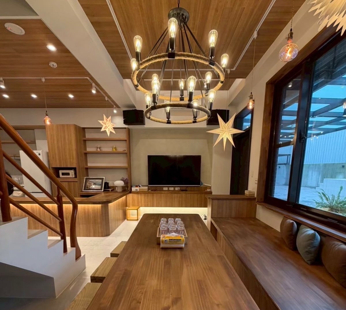 宜蘭知名建築師作品 設計師精心改造設計 每個空間及小角落都極富巧思 讓生活在都市的人來到這裡 享受片刻鄉村寧靜與自在悠閒 不用到飛到國外就可以享受 絕佳的冬山河岸鄉村景觀 歡迎官方Line詢問 週六連續假期會有基本14位計費 低於14位,仍需要以14位計費 來這裡你可以享受的事情 1/KTV/120吋超大螢幕享受 2/可以打麻將專業電動麻將桌 3/SWITCH 遊戲機/街頭霸王月光寶盒遊戲/手足球檯/兒童積木桌/兒童廚房 4/可以玩桌遊多款最流行桌遊 5/可以烤肉及圍爐吃火鍋🍲 提供專業烤肉設備及電磁爐 6/可以看120吋大螢幕電影 7/可以在夢幻廚房做甜點料理 跟姐妹下午茶☕️提供整套廚房設備 8/可以好友家人相聚喝酒聊天一整晚 廚房設備 國際牌蒸汽烤箱/微波爐/氣炸鍋/小烤箱/雙口IH爐/烤麵包機/Nespresso咖啡機/奶泡機 我們提供多項兒童及嬰兒設備 嬰兒床/嬰兒澡盆/兒童餐具/兒童椅/嬰兒消毒鍋/洗澡椅 週六基本14位計費 $29800 連續假期基本14位計費 $30800-31800 特殊節日會有不同價格