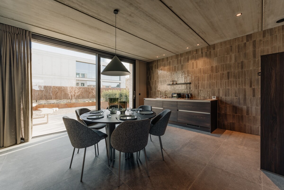 Cette maison à Oupeye est un refuge végétal ouvert sur la Meuse. Le bois, la pierre naturelle et les plantes créent une atmosphère apaisante, en lien direct avec la nature. Les larges ouvertures laissent entrer la lumière et le paysage, brouillant la frontière entre intérieur et extérieur. À proximité du centre d’affaires Bord de Meuse (coworking, salles de réunion, salle de sport) et du RAVeL, le lieu est idéal pour travailler au calme et se ressourcer au bord de l’eau.