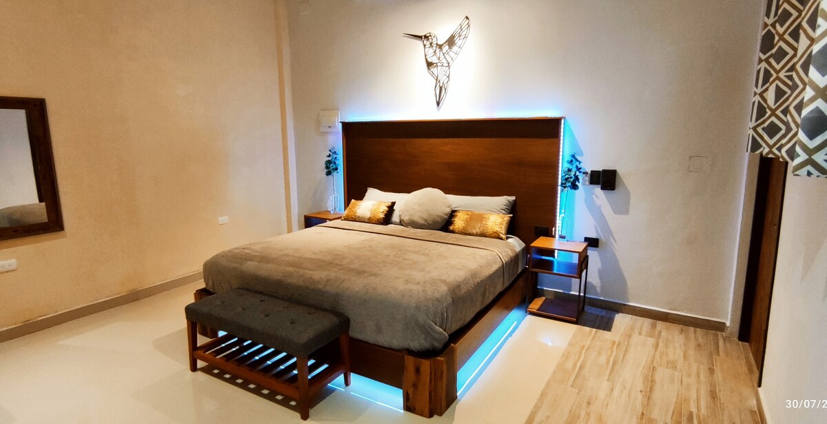 Cozy one-bedroom apartment located in the south of Cancún. 15 minutes from the hotel zone and 18 minutes from the airport. The apartment features: -One King-size bed -One double sofa bed -1 bathroom -Equipped kitchenette (stove, microwave, refrigerator, and coffee maker) -Air conditioning units. Important Information: The listing corresponds to an apartment located on the upper floor. The building does not have an elevator. The lobby located on the ground floor and the pool are shared areas.