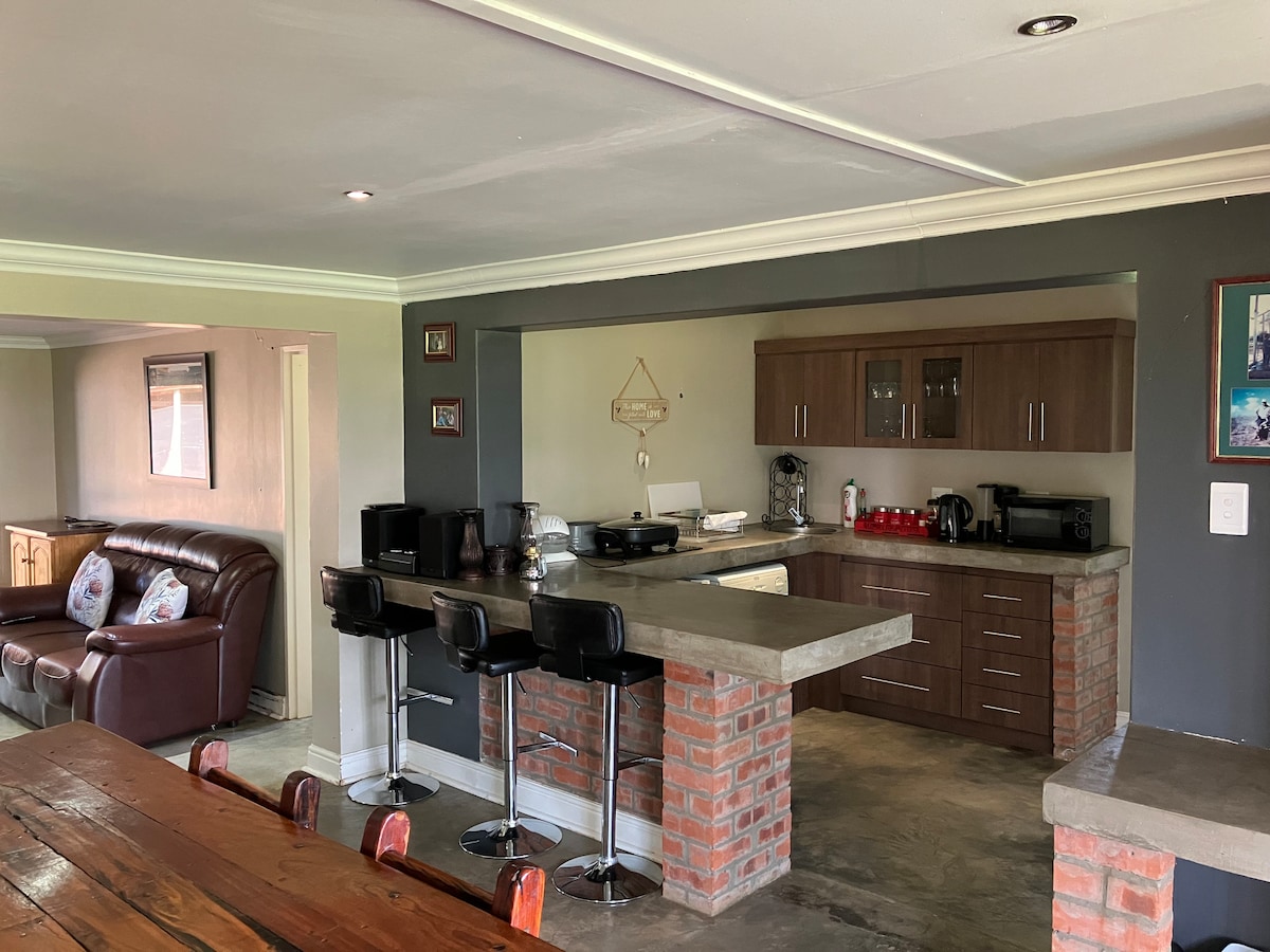 Verbinde dich mit geliebten Menschen in dieser familienfreundlichen Unterkunft. Wunderschönes Bauernhaus mit 4 Schlafzimmern, geeignet für Familienurlaube, Veranstaltungen, Hochzeiten, Babypartys, Junggesellen- und Junggesellinnenabschiede. Nur 15 Minuten von Makro Bloemfontein an der N8 in der Nähe der Brug entfernt. Geräumige 4 Schlafzimmer, eine große Küche, ein Ess- und ein TV-Raum. Unterhaltungsraum mit Billardtisch, Bar in Braai. DSTV