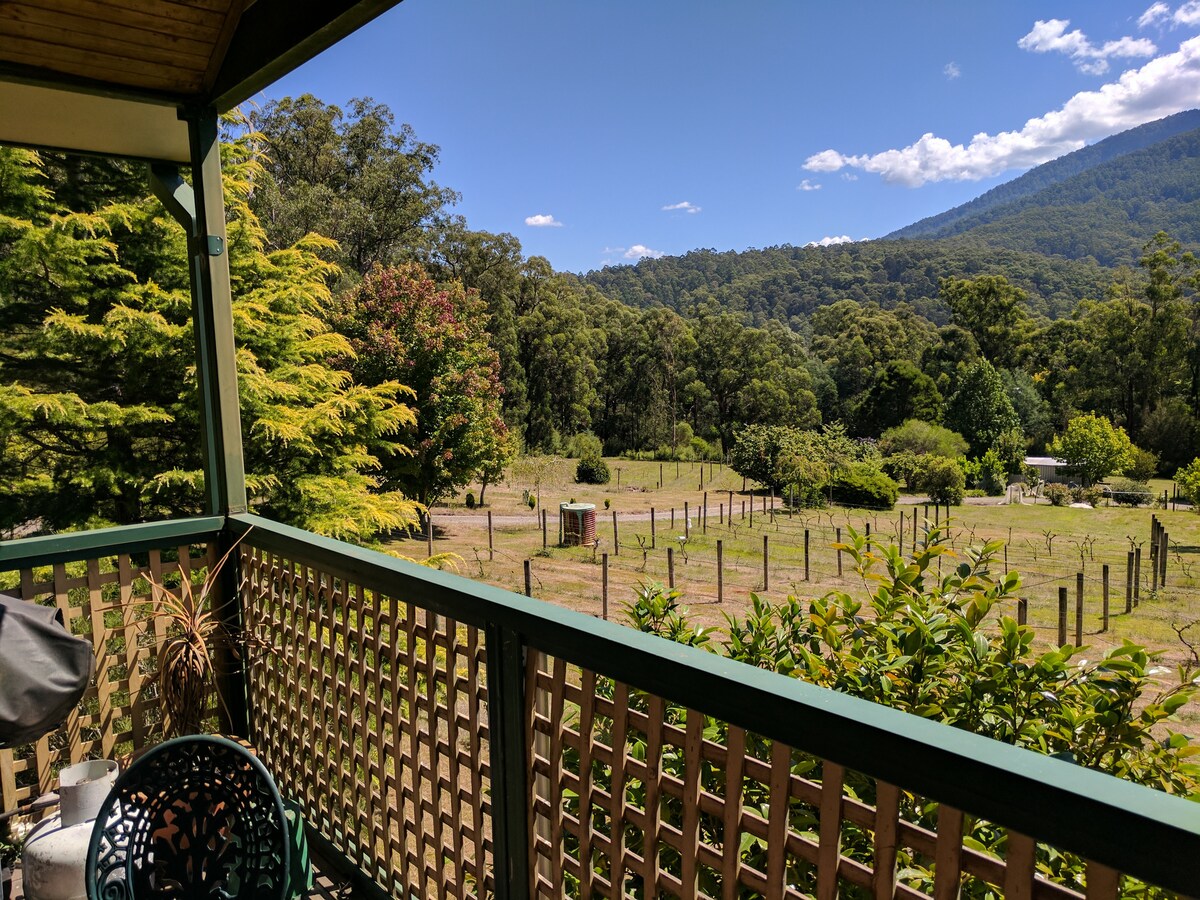 Das Little House on the Hill am östlichen Ende von Warburton überblickt die Hühner, den Gemüsegarten, den Obstgarten und über das Tal hinweg eine herrliche 270°-Aussicht. Es liegt neben dem Big House, auf einem Acker, der zum Yarra River hinunter abfällt. Ein toller Badeort an heißen Tagen und eine gute Möglichkeit, die Stadt und den Rail Trail zu erreichen (fünf Minuten dorthin, vielleicht zehn Minuten zurück - bergauf). Es gibt jede Menge schöne Spaziergänge in der Nähe, einschließlich des Aquäduktpfads, der weiter oben auf dem Hügel beginnt.