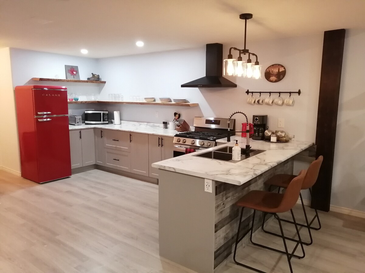 This stylish bungalow is perfect for a small group; it is your home away from home. Entire top floor of bungalow with over 1250 square foot of renovated space, 20 minutes away from Jasper national park and an hour to the town of Jasper. Essential services such as grocery, restaurants, etc. are about a three-minute drive. Fully stocked kitchen with everything you may need: Utensils, stove, fridge, dishwasher, coffee maker, Kettle, microwave, toaster, juicer, mixer, kitchenware, etc.