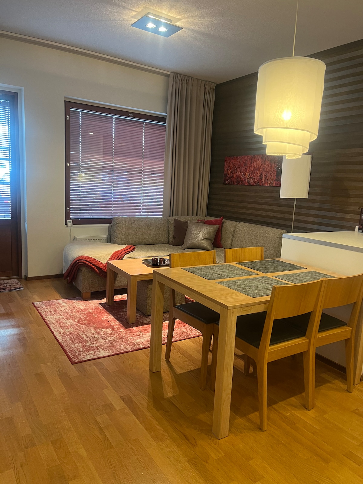 Feel cozy and relaxed in this beautifully renovated wooden semi-detached log cabin. Perfect view to Ylläs-fjell. Atmospheric sauna and bathroom. Fully equipped kitchen. Separate toilet. No light pollution, good for seeing northern lights! Two bedrooms, each with 160cm double beds. Also a bunk bed (perfect for kids or youngsters). A baby cot available. Walking distance to food store, restaurants, cafe’s, bus stop. Ski tracks 400m. Restaurant 700m, shop 1 km. Gondola 5 min drive.