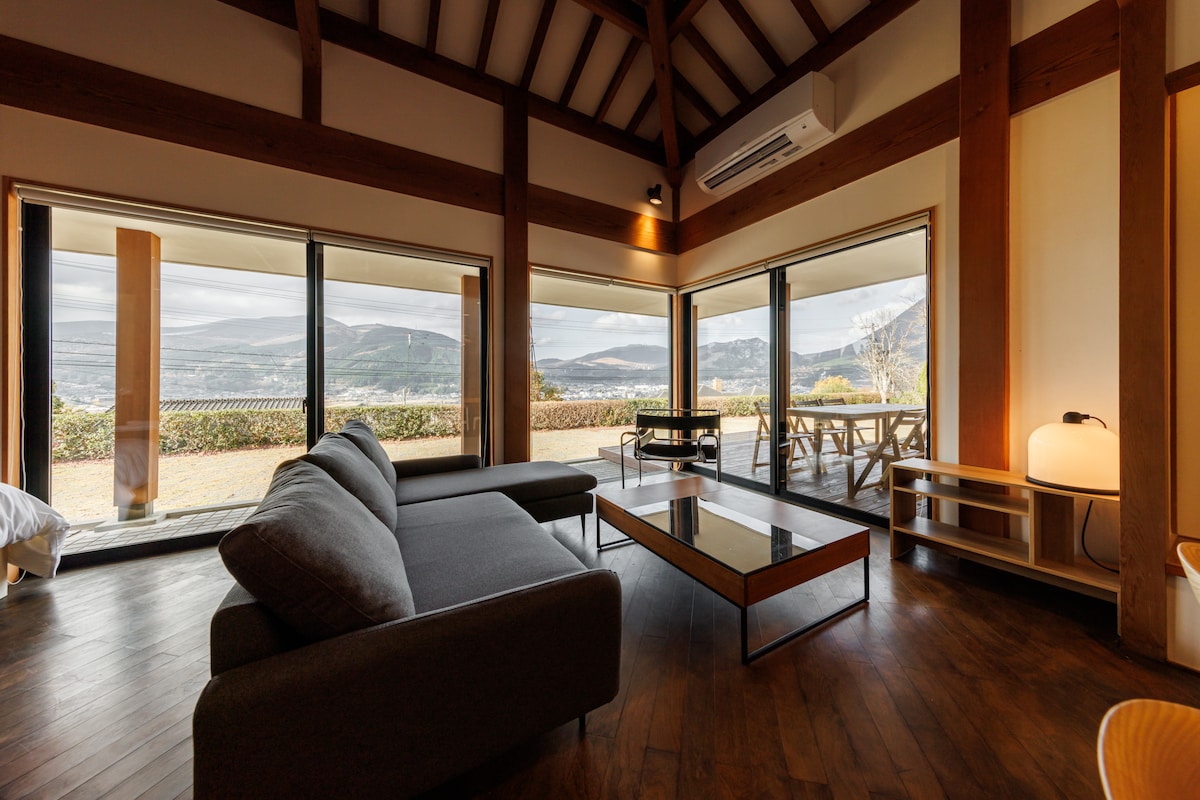 Dieses Haus war früher die Residenz des Besitzers einer jahrhundertealten Bäckerei in der Stadt. Es ist ein zweistöckiges Haus im westlichen Stil, das japanische und westliche Elemente kombiniert. Nach einem Upgrade und einer Renovierung durch eine Designerin ist es zu einem ästhetisch ansprechenden und gemütlichen Raum geworden. Die geräumige Außenterrasse bietet einen Panoramablick auf das gesamte Yufuin-Gebiet, mit dem Yufu-Berg direkt vor Ihren Augen. Von hier aus kannst du auch einen perfekten Blick auf das berühmte Feuerwerksfestival genießen.