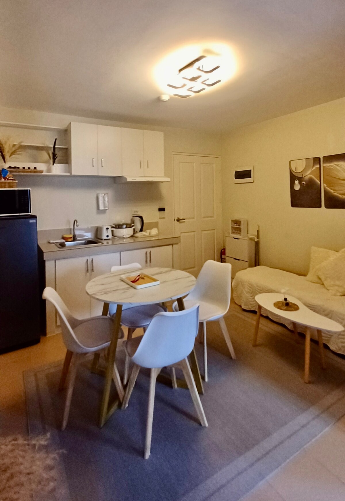 Gemütliches und sauberes 1-Bett-Zimmer, Wohnung kommt mit Bettwäsche und Küchengeräten für dein einfaches Leben. Es hat auch einen hauseigenen Waschsalon mit einem sehr erschwinglichen Service und einem sehr nahen Spielplatz, wo du trainieren kannst. Es ist ein 5~7-minütiger Spaziergang zur neu eröffneten CITY Mall, die sehr praktisch zum Einkaufen ist. Nur wenige Gehminuten vom privaten und öffentlichen Krankenhaus (Silliman Medical Center und Negros Oriental Provincial Hospital) und Schulen (Silliman University, Negros Oriental State University) entfernt.