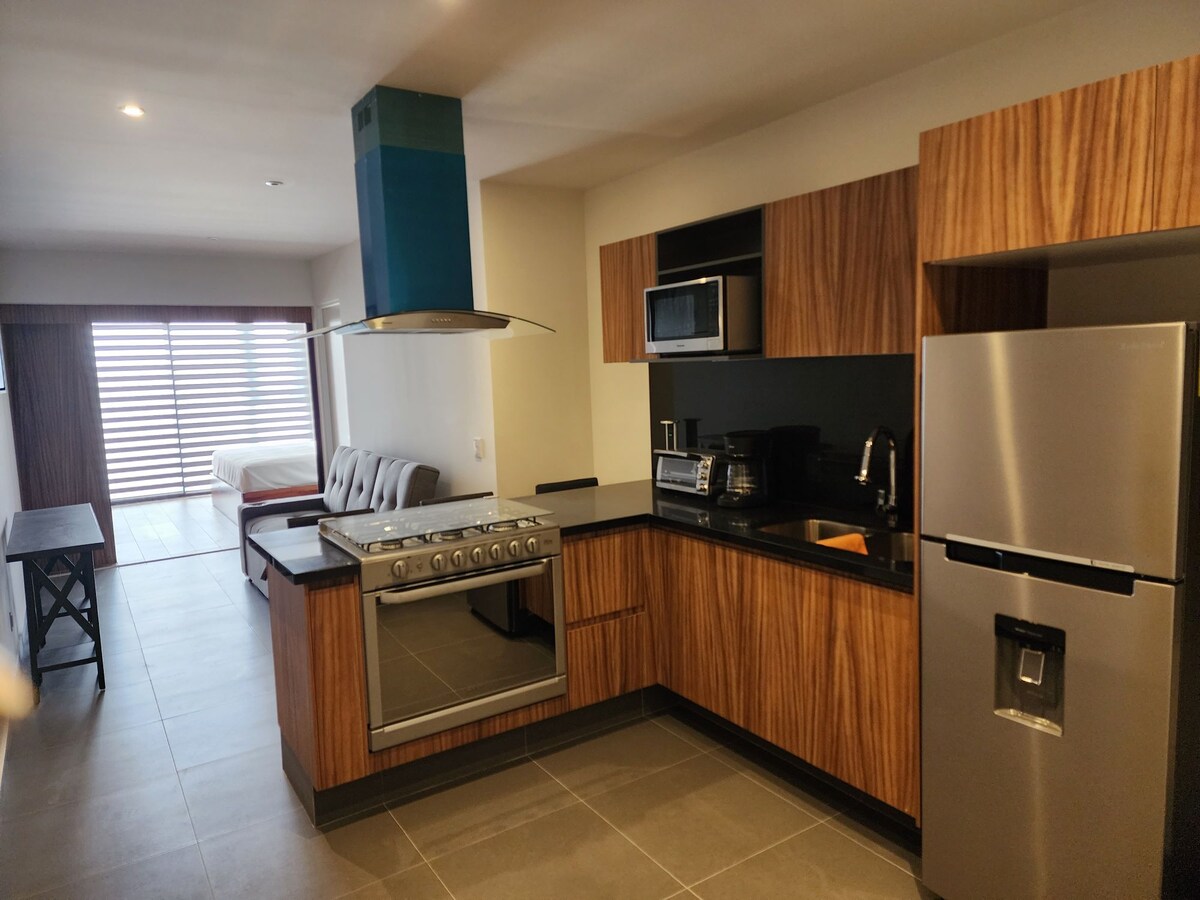 Geben Sie Ihren Spaziergängen und Ihren Tagen einen spektakulären Ausgangspunkt, an dem sich verschiedene Stile zu einem einzigartigen Erlebnis verbinden. Rustikale Möbel, voller Farbe, erwecken diese moderne Wohnung zum Leben. Ihr Balkon ist ein Juwel. Die Studio-Wohnung ist ein offener Raum, in dem alle Aktivitäten miteinander verbunden sind und Sie viel Platz haben. Sie können jederzeit die Verbindung zur Terrasse genießen, die durch ein sehr großes Fenster besteht, das viel Licht in den Innenraum bietet und einen spektakulären Blick auf die Stadt bietet. Es wird Ihr Zuhause und unser größter Wunsch ist, dass Sie es in vollen Zügen genießen. Wir erwarten Sie!! Im Erdgeschoss befindet sich ein städtischer Garten, in dem Sie die vielen Arten von Heilpflanzen und essbaren Pflanzen genießen und Bio-Ernten für Ihren persönlichen Gebrauch anbauen können, um Ihren Aufenthalt zu bereichern. Wir empfehlen Ihnen, es zu genießen, da es ein sehr schöner Raum ist, der mit viel Liebe entworfen wurde. Wir würden uns freuen, wenn Sie ihn erleben und genießen können. Wir erwarten Sie!!! Für uns ist dein Aufenthalt und Komfort das Wichtigste und wir werden aufmerksam auf alle Bedürfnisse achten, die du hast, um sie sofort zu lösen. Wir freuen uns auf dich und genieße unsere Wohnung, die ohne Zweifel deine beste Option ist Die Wohnung befindet sich in einer ruhigen, kulturellen und gastronomischen Gegend, ideal, um Guadalajara zu erleben. Sie ist drei Blocks vom Mercado Juárez oder Mercado México und 20 Minuten zu Fuß vom historischen Zentrum entfernt. Wir empfehlen Ihnen, sich zu bewegen und die Stadt zu Fuß zu erkunden. Die Wohnung ist perfekt gelegen, um Guadalajara zu erleben, ganz in der Nähe des historischen Zentrums, des Paseo Chapultepec, in einer ruhigen, kulturellen und gastronomischen Gegend. Viele der Attraktionen unserer schönen Stadt kannst du genießen, ohne dein Geld für Transportmittel ausgeben zu müssen. Das Gefühl, die Wohnung zu bewohnen, ist sehr angenehm und gemütlich, wenn du die Fenster öffnest und der Raum ist einer, der in die Terrasse integriert ist, wirst du es sehr genießen. Nachts kann man von der Terrasse aus in der Ferne den Start der Flugzeuge beobachten und es ist ein Spektakel, das man genießen kann. Auf der Calle de Libertad oder in der Umgebung des Juarez-Marktes (von der Terrasse aus und nach links blickend sehen Sie ihn 2 Blocks entfernt), können Sie in mehreren Cafés leckeres Frühstück genießen, die überwiegende Mehrheit hat Terrassen mit Bäumen und Pflanzen, Sie werden sehr angenehme und ruhige Momente erleben.