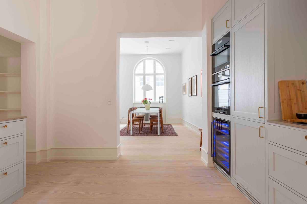 Unique and magnificent private apartment in an unbeatable location at the heart of Inner Copenhagens middle age area. Your own “town house” with a private entrance from a quit sidestreet. A high-end luxury spread over 140 sqm, you stay in a fusion Art Gallery luxury apartment Design furniture, hand built kitchen, wooden floors. high ceilings, contemp. art. Historic estate built in 1789 once a theater This place is also perfect for business meetings / work stays of longer or shorter periods
