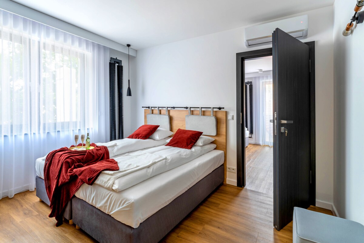W samym sercu miasta, w otoczeniu zieleni oferujemy Państwu na wynajem komfortowe mieszkania z sypialniami, które będą w stanie pomieścić większą liczbę osób. Wszystkie mieszkania posiadają w pełni wyposażoną kuchnię (lodówka, zmywarka, płyta kuchenna i ekspres do kawy), klimatyzację oraz dostęp do bezpłatnego WiFi. Goście mają również możliwość skorzystania ze zlokalizowanej w sąsiadującym obiekcie sauny oraz rowerów.