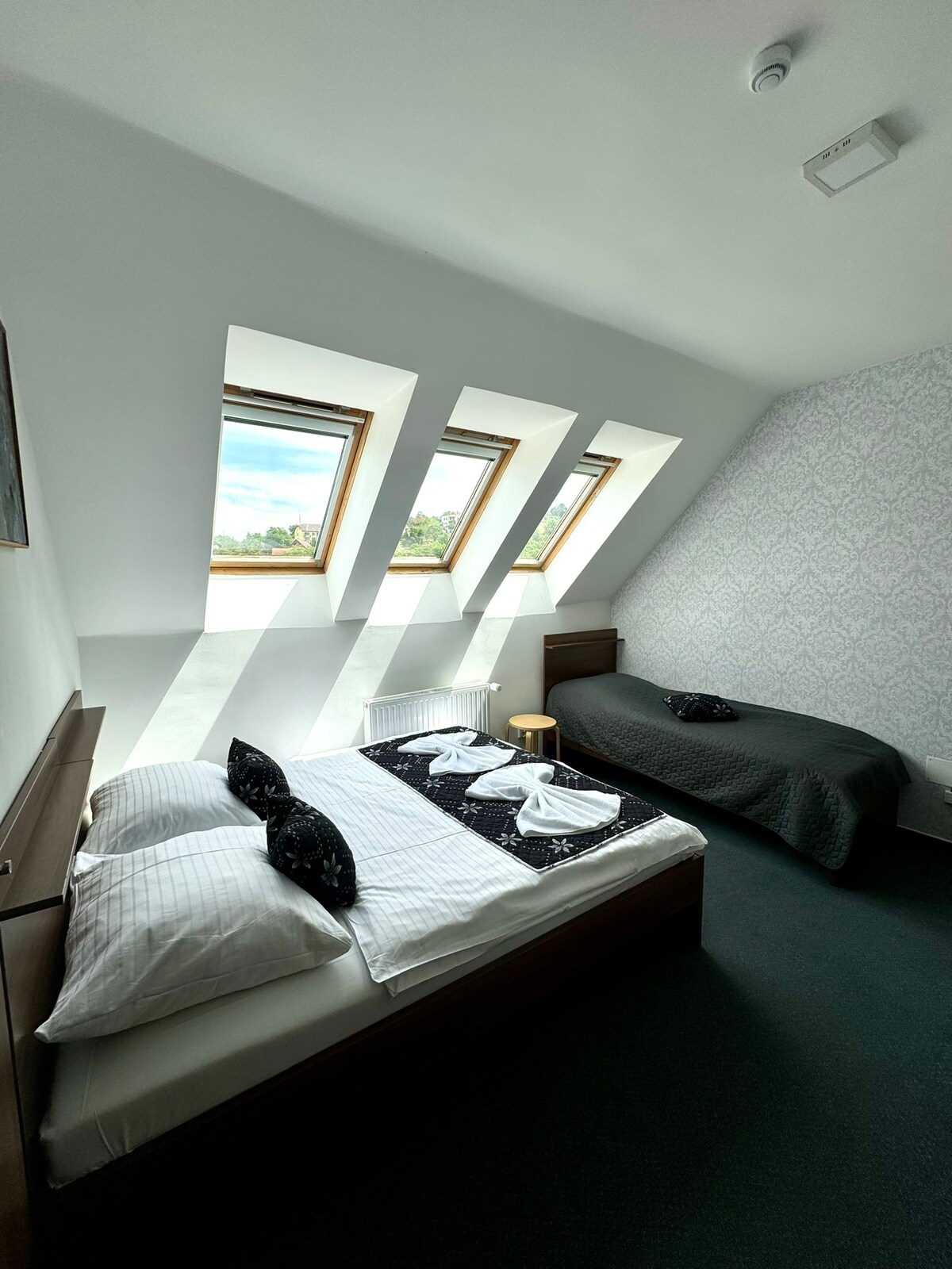 Třílůžkový pokoj pro tříčlennou rodinu. Pokoj se nachází v podkroví a k dispozici Vám bude nově zrekonstruovaná samostatná koupelna s vanou, televize, pracovní stůl, věšák na oblečení, střešní okno. Pokoj je ideální pro hosty, kteří preferují soukromí a klid - pokud byste přeci jen hledali příjemné rozptýlení, nebojte se využít naši společenskou místnost.