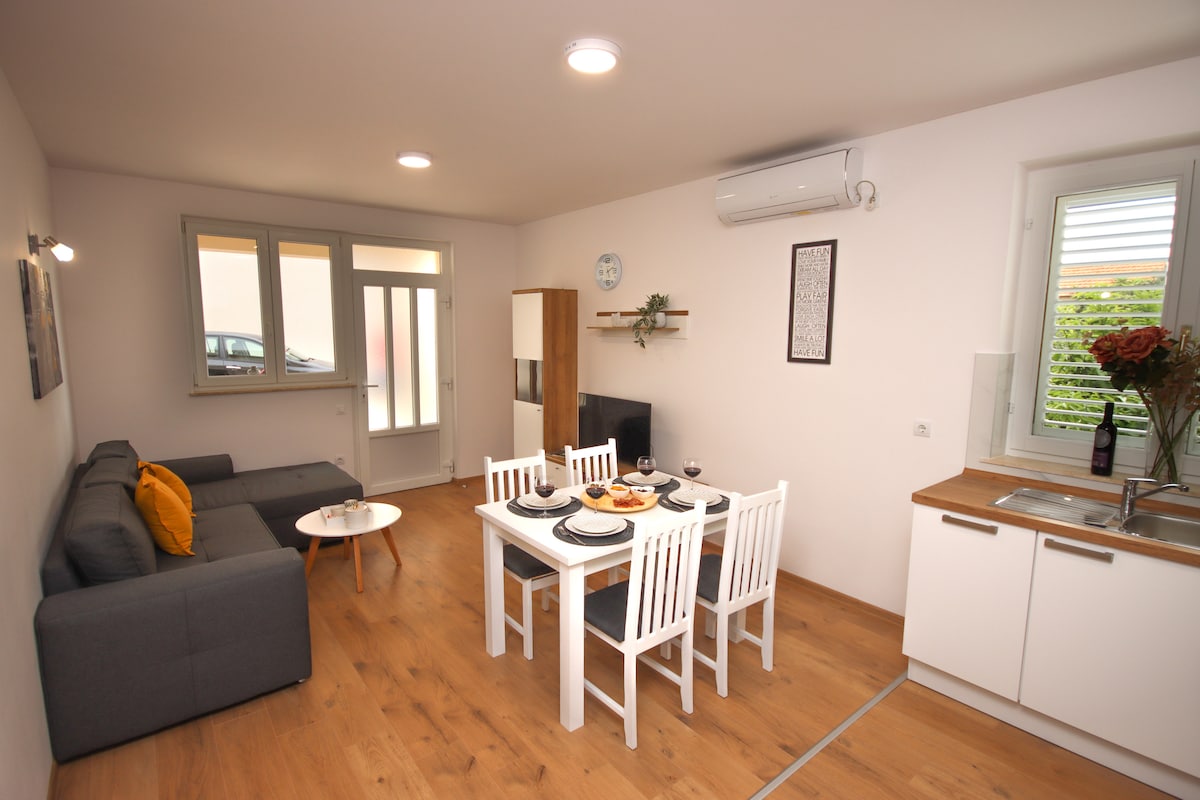 Sunset apartment is a newly refurbished apartment situated in a quiet place surrounded by a multitude of greenery and natural beauties with a beautiful view of the Adriatic Sea. Apartment is consisted of large open living and dining area with fully equipped kitchen, spacious master bedrooms with en suite bathrooms. Whole apartment is air-conditioned. The spacious terrace is perfect for those evenings you just want to chill out gazing at the beautiful Adriatic Sea.
